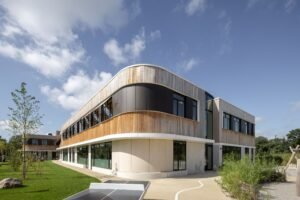 De grootste ontwerpuitdaging voor DP6 architectuurstudio was om het forse volume op de smalle kavel – 150 bij 25 meter – zo te ontwerpen dat het gebouw voor de kinderen kleinschalig, veilig en beschermd voelt, legt Ruben Aalbersberg, architect bij de Delftse architectuurstudio, uit. “We hebben een smal gebouw van twee bouwlagen ontworpen. Door dit lange volume in drie delen uit elkaar te schuiven, werd het opgeknipt in kleinschalige gebouwdelen en ontstond er op een vanzelfsprekende manier een voorplein en verschillende beschutte buitenspeelruimtes. De entrees bevinden zich, transparant en goed vindbaar, centraal op het voorplein, op de scharnierpunten en op de kopse kanten. De licht gebogen vurenhouten gevels en afgeronde hoeken geven het gebouw een zachte uitstraling. Waar je ook staat, het gebouw oogt kleinschalig en vriendelijk.”