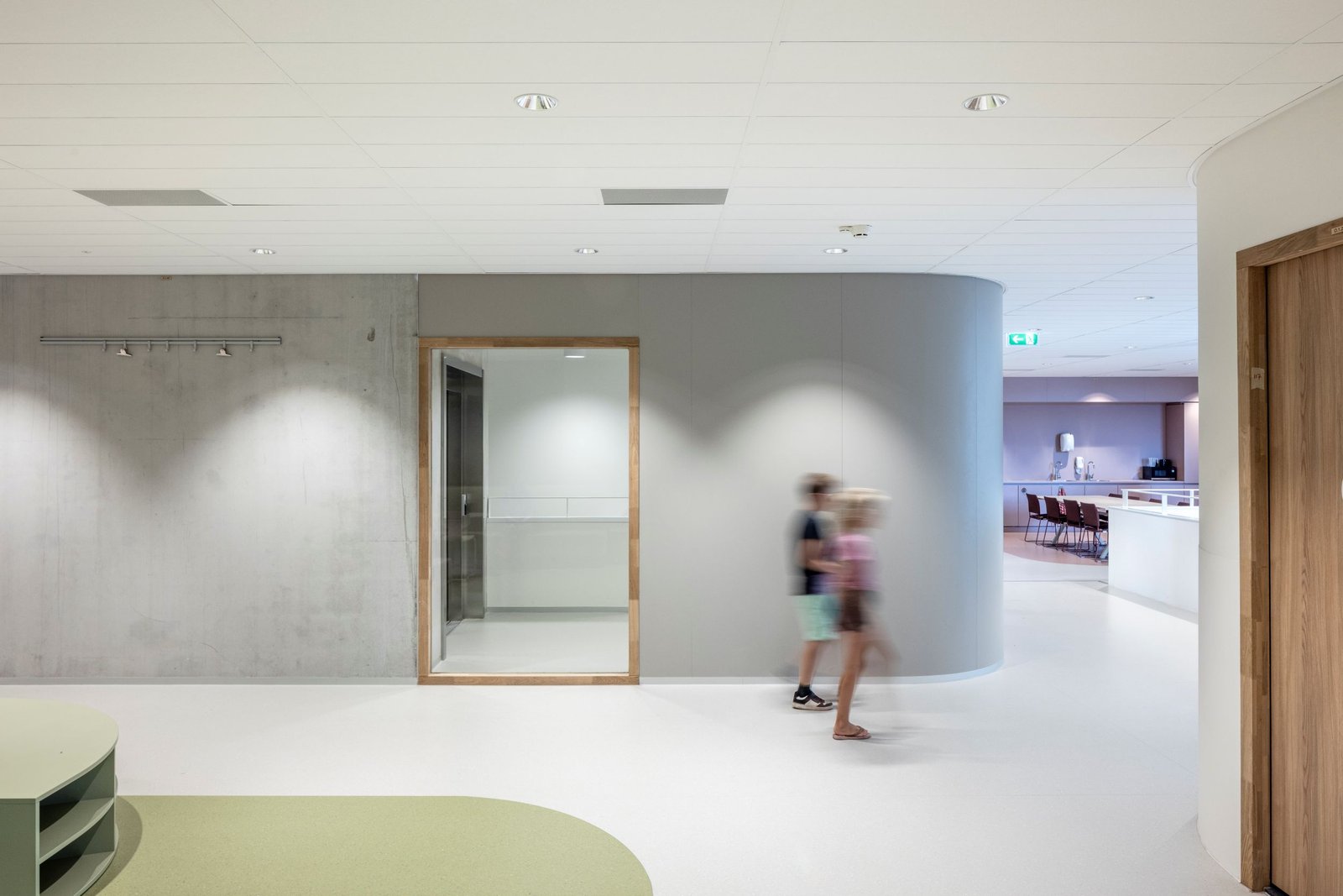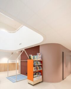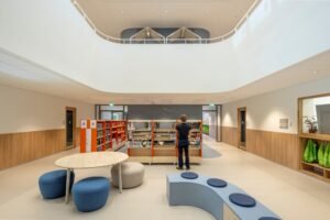 Ook in het interieur is veel aandacht besteed aan het creëren van intimiteit en rust, stelt de architect van DP6 architectuurstudio. “Natuurlijke materialen, afgeronde hoeken, veel daglicht en een uitstekende akoestiek vormen hiervoor de basis. Net als aan de buitenzijde van het gebouw zijn de zichtlijnen door de verspringingen en knikken nooit te lang, wat het grote gebouw kleiner doet aanvoelen dan het daadwerkelijk is.”