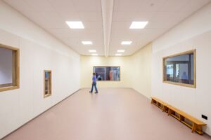 Aan de noordrand van het Friese Drachten zijn vijf scholen voor speciaal basisonderwijs ondergebracht in één gebouw. DP6 architectuurstudio maakte het ontwerp voor Samen Kansrijk Drachten, zoals de nieuwe school is gedoopt. De afbouw van het lange gebouw lag in handen van Bosma Plafonds & Wanden. Mede-eigenaar Jacco Eldering spreekt over het project van een ‘broodje van de bakker’-verhaal, maar dat was het niet alleen. “Door het enorme volume, de logistieke uitdagingen en een paar tegenslagen is het voor ons best een spannend project geweest.”