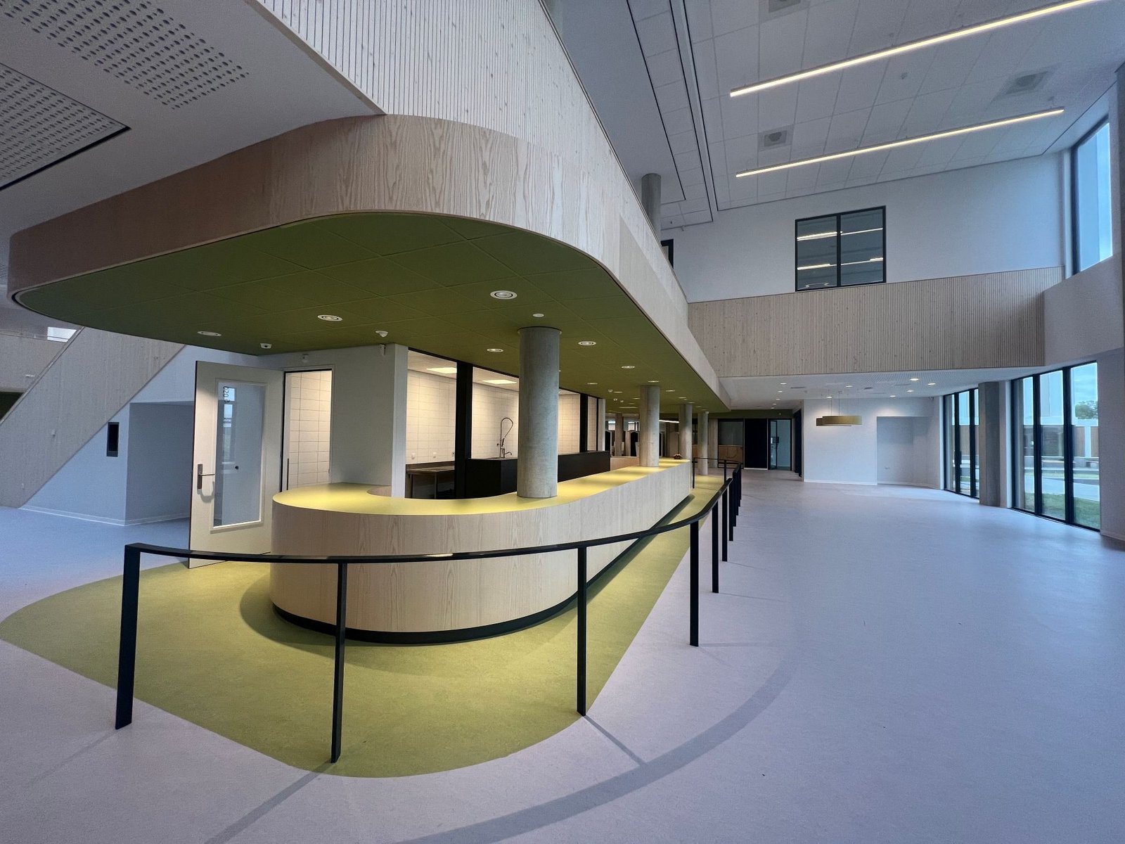 Het is pauze. Leerlingen staan voor de ingang met elkaar te kletsen. Een aantal loopt naar de verscholen fietsenstalling om naar de supermarkt in de buurt te gaan. Van buiten is niet direct duidelijk hoe het gebouw er van binnen precies uitziet. Architect Van Leeuwen vertelt: “Het gebouw bestaat uit een aantal vleugels met ieder een eigen plek voor de leerlingen. Kleinschalige en herkenbare domeinen. Rond de leerpleinen is een mix van gevarieerde onderwijsruimten geprojecteerd. De vleugels zorgen voor een overzichtelijke en ‘leesbare’ opzet van het gebouw. In het hart van het gebouw bevindt zich de centrale circulatieruimte waar de verschillende functies samenkomen. Aan deze ruimte bevinden zich een aantal pauzegebieden. Geen grote centrale aula, maar juist een aantal kleinere ruimtes verspreid door het gebouw aan de gevels met veel daglicht en zicht op groen. Leerlingen vinden hierdoor elk hun eigen plek waar zij zich thuis kunnen voelen.”