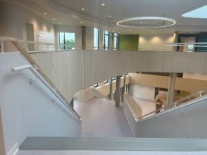 De trappen en vooral de balustrades vormden een volgende technische uitdaging voor Janse Afbouw, vertelt de directeur. “Vooral de hoogte van de koven was een dingetje. En daarnaast de overgang van het geperforeerde gips naar het standaard gips. De balustrades zijn aan één zijde op de rechte delen volledige bekleed met de 12,5 mm dikke stootvaste DuraGyp-plaat en op de ronde delen met 6 mm buigbaar gips. Dit hebben we op een Metal Stud-frame gemonteerd. De andere zijde van deze trappen en balustrades hebben we afgetimmerd met houten panelen die tevens een akoestische werking hebben. Rondom deze trappen en balustrades bevinden zich 1070 m² Gyproc Rigitone 12-20/66 met Activ’Air.”