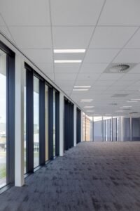 De rondleiding wordt voortgezet door Richard Uitzinger, projectleider bij G&P Afbouw. Het afbouwbedrijf uit Etten-Leur is verantwoordelijk geweest voor de montage van de (glazen) wanden en de plafonds. “Wij zijn erg vroeg in het proces bij het project betrokken. Hierdoor hebben we goed kunnen sparren met Heembouw en ook met de andere onderaannemers. We hebben gewerkt met een Leanplanning, waarbij wij de leidende partij waren. Het was fijn dat we dit spelletje al eerder hadden gedaan bij de bouw van Nabuurs I en bij andere projecten voor Heembouw. Hierdoor konden we goed overleggen met bijvoorbeeld de installateur om de werkvolgorde te bepalen. Je hebt immers al een goede connectie, dan wordt een voorstel eerder geaccepteerd. Elke ochtend leidden Walter Vijfwinkel en Lars Koelewijn zogenoemde startdaggesprekken met de onderaannemers. Deze waren bedoeld om vooruit te kijken om eventuele knelpunten voor te zijn”, legt hij uit.