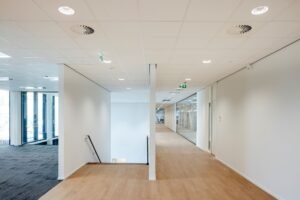 Elk project heeft – ondanks dat vrijwel elk afbouwbedrijf in alle bescheidenheid zal beweren dat het standaardwerk is – wel een of meerdere technisch vernuftige oplossingen of uitvoeringen. Zo ook bij Nabuurs II, blijkt na lang navragen. Uitzinger: “De trap bij binnenkomst leverde wat denkwerk op. Qua werkvolgorde en qua uitvoering. Wij hebben de wanden gemonteerd, waarna de trap is geplaatst. We hebben toen ook alvast het systeemplafond gemonteerd, waardoor we alles met een hoogwerker konden doen. Anders had een steiger over de trap worden gebouwd, hetgeen onmogelijk leek.”
