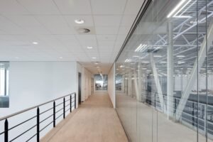 Binnen elk project zijn er altijd wel kleine of grote tegenvallers waar de bouwpartijen mee te maken krijgen. Voor G&P Afbouw was dat de levering van de spectaculair hoge glazen wanden. “Voor de transparantie binnen het gebouw hebben we heel wat glazen wanden geleverd en gemonteerd. De opdrachtgever wilde dat de directie op de bovenste verdieping vanuit het kantoor de distributieruimte in kon kijken. Om dit mogelijk te maken hebben we glazen wanden van de vloer tot aan het dak gemonteerd. De complete glazen corridor bestond uit wanden met een hoogte van 5,60, de totale hoogte van de twee verdiepingen betrof 9 meter in het zicht. In Europa zijn slechts twee fabrikanten die glazen wanden met deze afmetingen kunnen leveren, één in Duitsland en één in Italië. Wij hadden voor de Italiaanse fabrikant gekozen. Alles was goed ingemeten en de productieplanning was bepaald, waardoor de wanden op tijd geleverd konden worden. Door een defect onderdeel in de productie lag het werk in de fabriek echter twee weken stil. Het transport werd uitgesteld en de wanden konden pas een kleine vier weken later worden geleverd. Op zo’n moment kom je erachter dat het goud waard is om met betrouwbare en meedenkende partners samen te werken. Samen met Heembouw hebben we een oplossing kunnen vinden en de planning aan kunnen passen op een manier dat de bouw geen vertraging op zou lopen.”