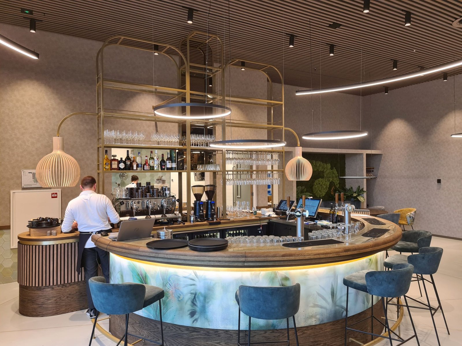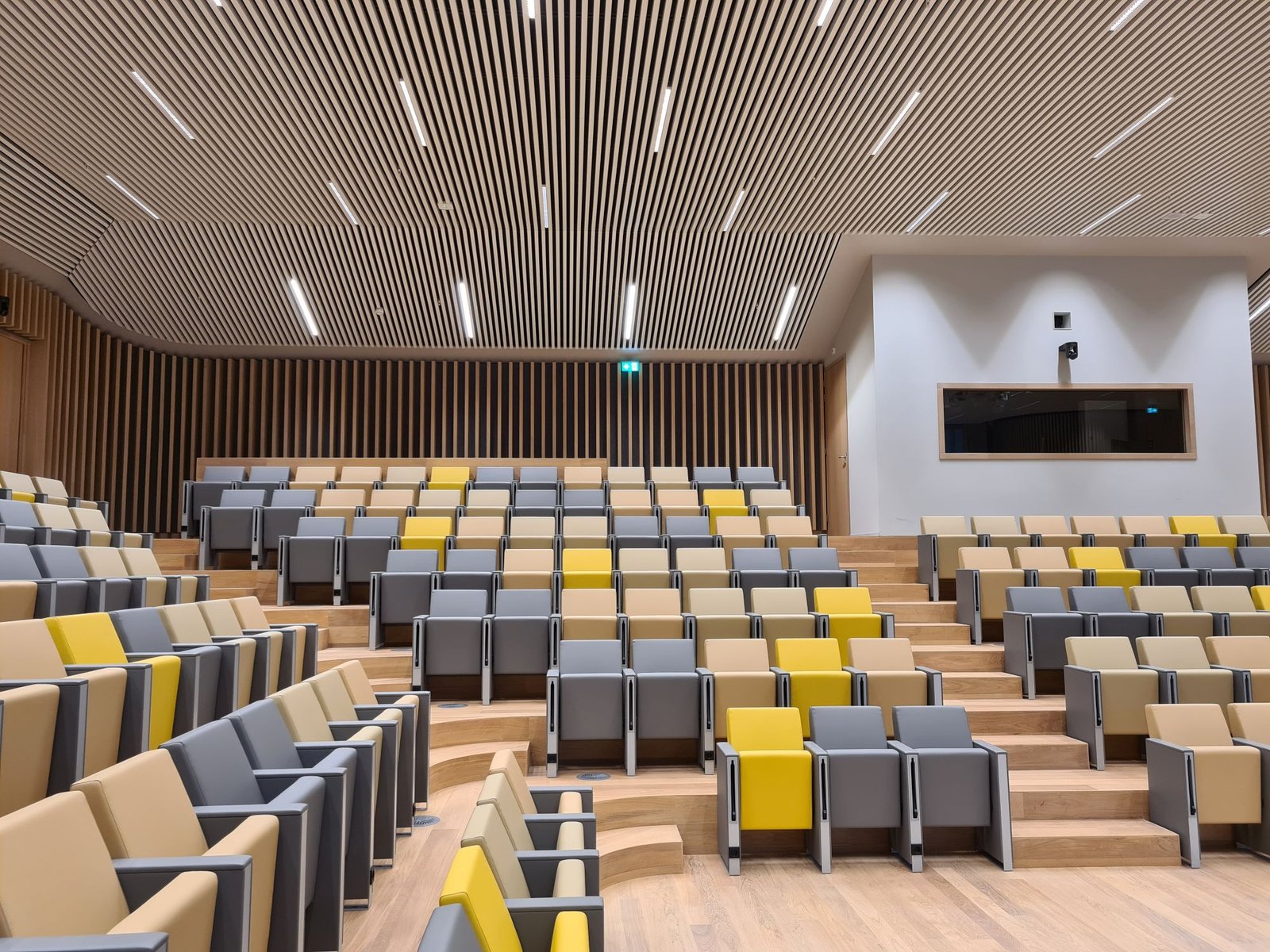 De combinatie van de aluminium lamellen en de verticale houten latten op de wand zorgt voor een fascinerend lijnenspel. “Die houten wanden zie je onder andere ook in de gangen. Die zijn prachtig gemaakt door interieurbouwer Parthos. In de grote zaal lopen ze als het ware door in het plafond. Om de aluminium lamellen in de hoeken mooi aan te laten sluiten hebben we een special bedacht. De architect had hier geen oplossing voor bedacht. Het lijnenspel van de lamellen moest doorbroken worden, omdat de aansluiting niet in 145 graden kon. Daarom hebben we hiervoor hoekkepers aangebracht door een stalen strip toe te passen. Nu loopt het perfect door”, vertelt Van der Veen trots.