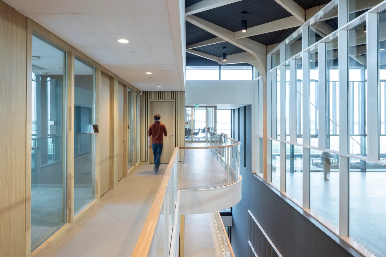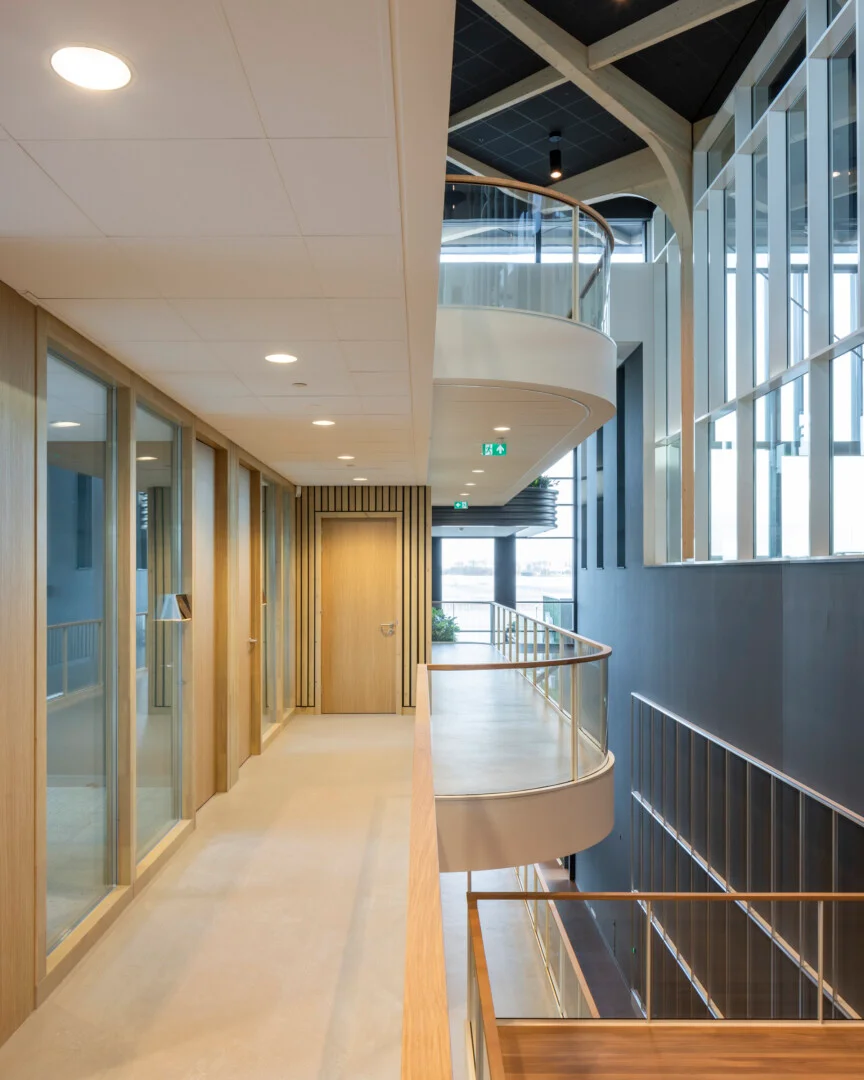 Het andere kleurgebruik is rustig gehouden, er is veel wit toegepast. Sjaak: “De overheersende kleur van de plafonds in de gangen en de kantoren is wit. Hier hebben we Rockfon Pallas wit in de afmetingen 60 x 60 en 60 x 120 gemonteerd. Het wit komt ook terug in de akoestische wandpanelen met microperforatie aan de ene buitenzijde van het kantorenblok, aan de andere kant zijn lichtgrijze akoestische panelen met microperforatie gemonteerd.”