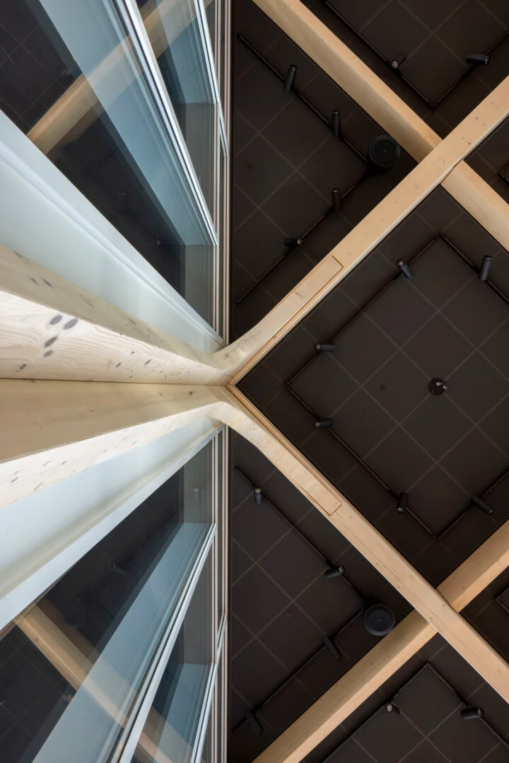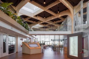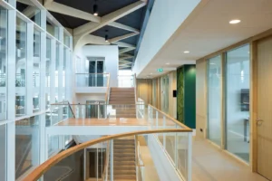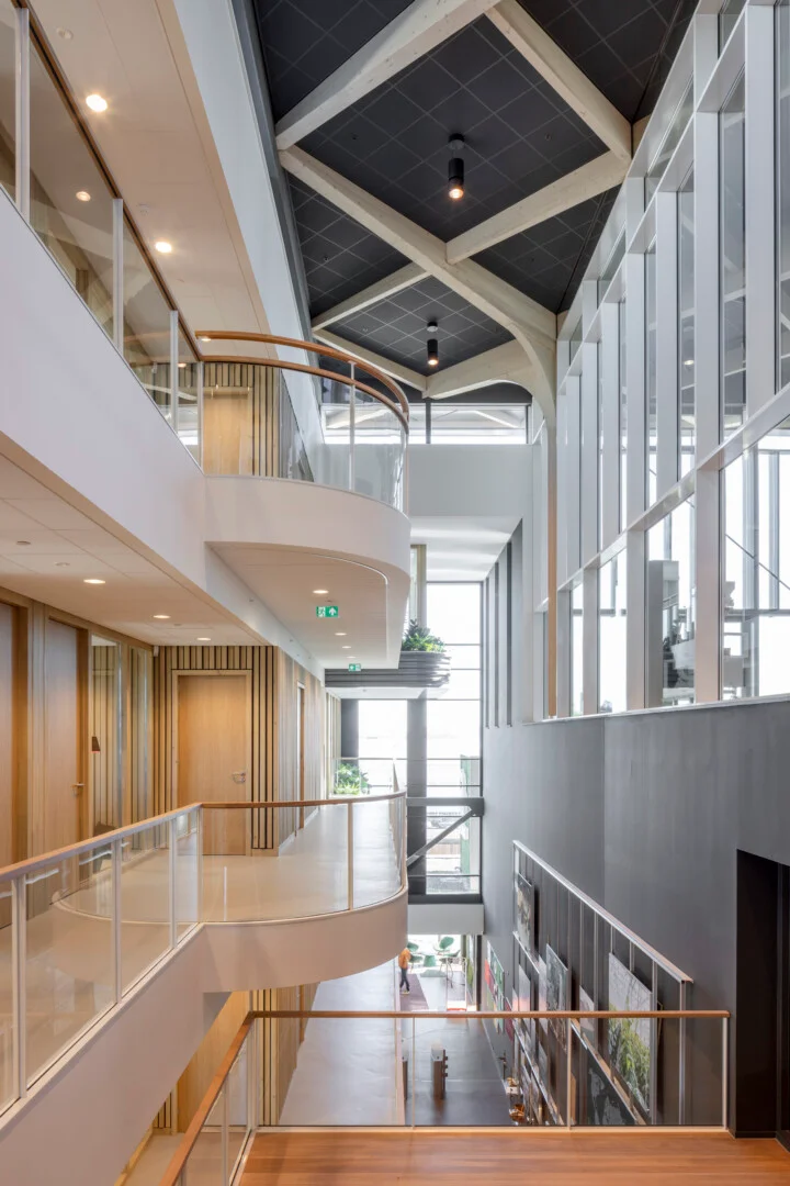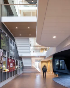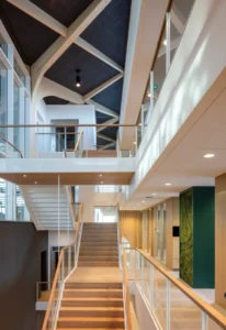 “Ik zeg dat niet vaak, maar het ontwerp van de architect is echt prachtig.” Sjaak doelt op de multifunctionele ontmoetingsruimte (MFO) in het centrale atrium. “De spanten zijn in een ruitvorm uitgevoerd en zichtbaar gebleven. In de vlakken van de ruit hebben wij de al genoemde Color-all Special panelen gemonteerd. Een echt blikvanger, ook door het contrast qua kleuren. De lichte houtkleur van de spanten, deze kleur komt ook terug in de trappen en akoestische wandbeplating – die wij overigens custom made hebben gemaakt – in combinatie met het donkergrijs van de plafondpanelen en het groen van de planten in de bakken en de mospanelen, die wij overigens niet hebben gemaakt. Het is echt een plaatje om te zien”, vertelt hij enthousiast.