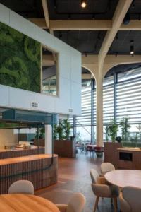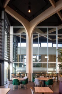 Verbinding speelt in dit project op meerdere niveaus een belangrijke rol, aldus de architect. “Verschillende functies en gebouwdelen – zoals het logistiek centrum, de extractiehal, kantoren en het centraal gelegen ontmoetingscentrum – zijn samengebracht in één samenhangend geheel. Belangrijk is de verbinding tussen de werkomgeving en de natuur. In het ontwerp is sterk gefocust op de relatie tussen binnen-buiten, vanuit het oogpunt van een gezonde werkomgeving. Zo zorgt een grote patio binnen bijvoorbeeld voor daglicht en beleving tot in het hart van de fabriek. Daarnaast is het een aangename buitenruimte voor medewerkers.”