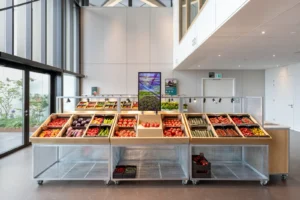 Medewerkers bekijken de groenten die in dozen in houten bakken staan opgesteld. Verschillende soorten tomaten, paprika’s, aubergines, komkommers, noem maar op. Deze groenten zijn opgekweekt uit zaden die Rijk Zwaan uit vruchten en groenten heeft gehaald. Dit gebeurt in het Seed Connect Centre, gebouwd naast de hoofdlocatie in De Lier. Het bedrijf richt zich op de ontwikkeling en productie van hoogwaardige groenterassen voor de professionele voedingstuinbouw onder glas en in de volle grond. In het nieuwe Seed Connect Centre worden zaden uit vruchten gehaald, het zaad schoongemaakt en voorbereid op de verkoop. Het nieuwe gebouw heeft ook een speciale ruimte waar bezoekers kunnen zien wat Rijk Zwaan doet.