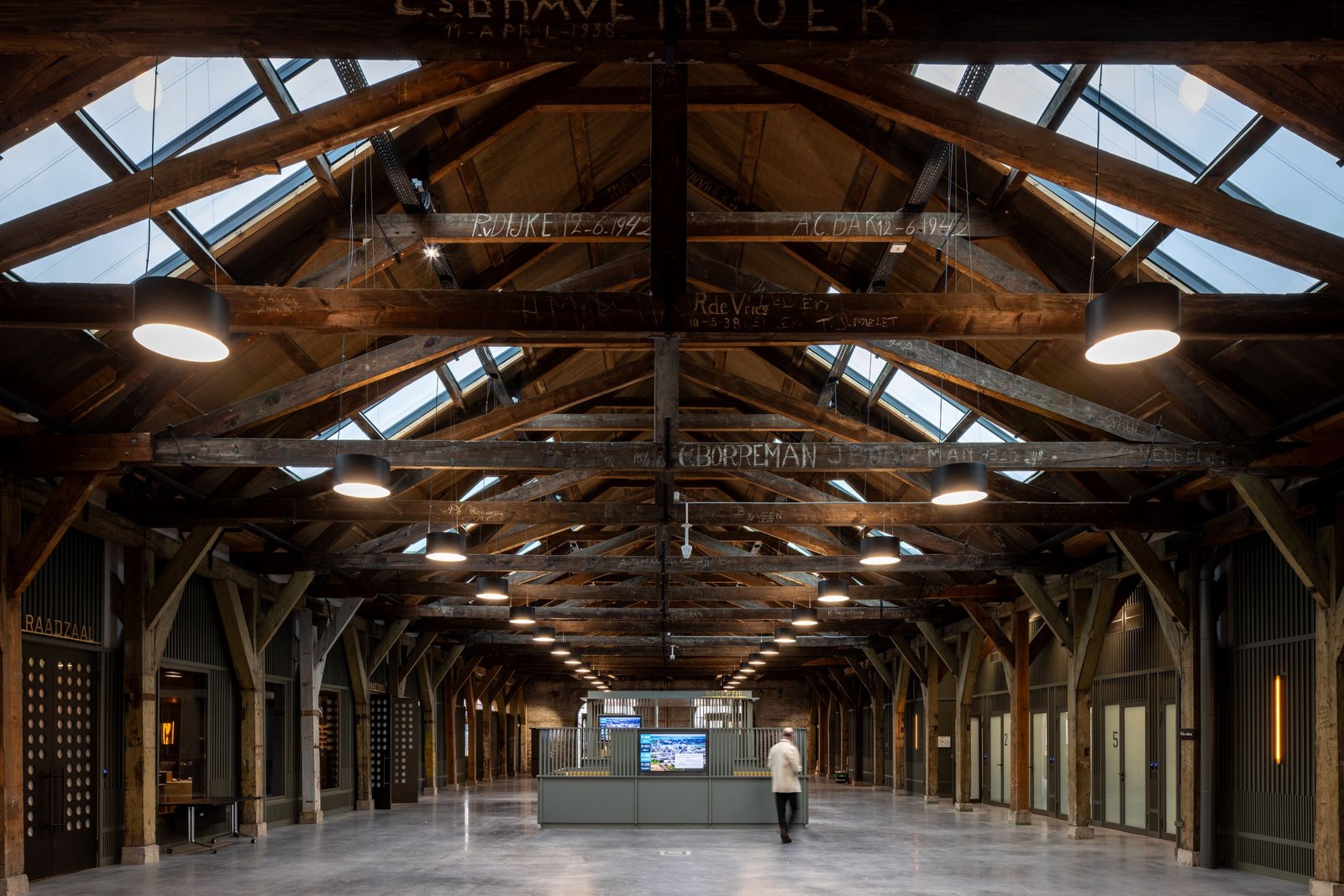 Een van de elementen die in het nieuwe stadhuis een prominente plaats innemen, zijn de balken in de binnenstraat van het gebouw, waar nu de publieksbalies, de raadzaal en trouwzaal en het vergadercentrum zijn geplaatst. Op de balken staan namen, als een soort graffiti uit het verleden. Dit zijn namen van mensen die of hier of elders op de marinewerf hebben gewerkt. De architecten wilden deze eyecatcher behouden in het ontwerp, maar sommige balken bleken aangetast door houtworm. “Oorspronkelijk wilden we de hele balkenconstructie behandelen tegen houtworm en andere diertjes, maar onderzoek op een proefstuk wees uit dat de behandeling ervoor zorgde dat de namen minder goed zichtbaar werden. Daarom zijn de plekken behandeld die niet in het zicht liggen”, laat architect Van Dam optekenen.