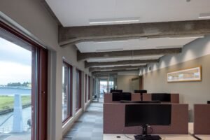 In de kantoren zijn ook klimaatplafonds van Verwol toegepast. “Om de metalen klimaatplafonds hebben we voor een betere akoestiek wederom de naadloze Rockfon Mono Acoustic-panelen gemonteerd. Overigens zijn we bij de werkzaamheden goed geïnstrueerd en begeleid door de projectadviseurs van Rockfon. We zijn niet voor niets Rockfon partner.”