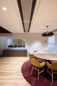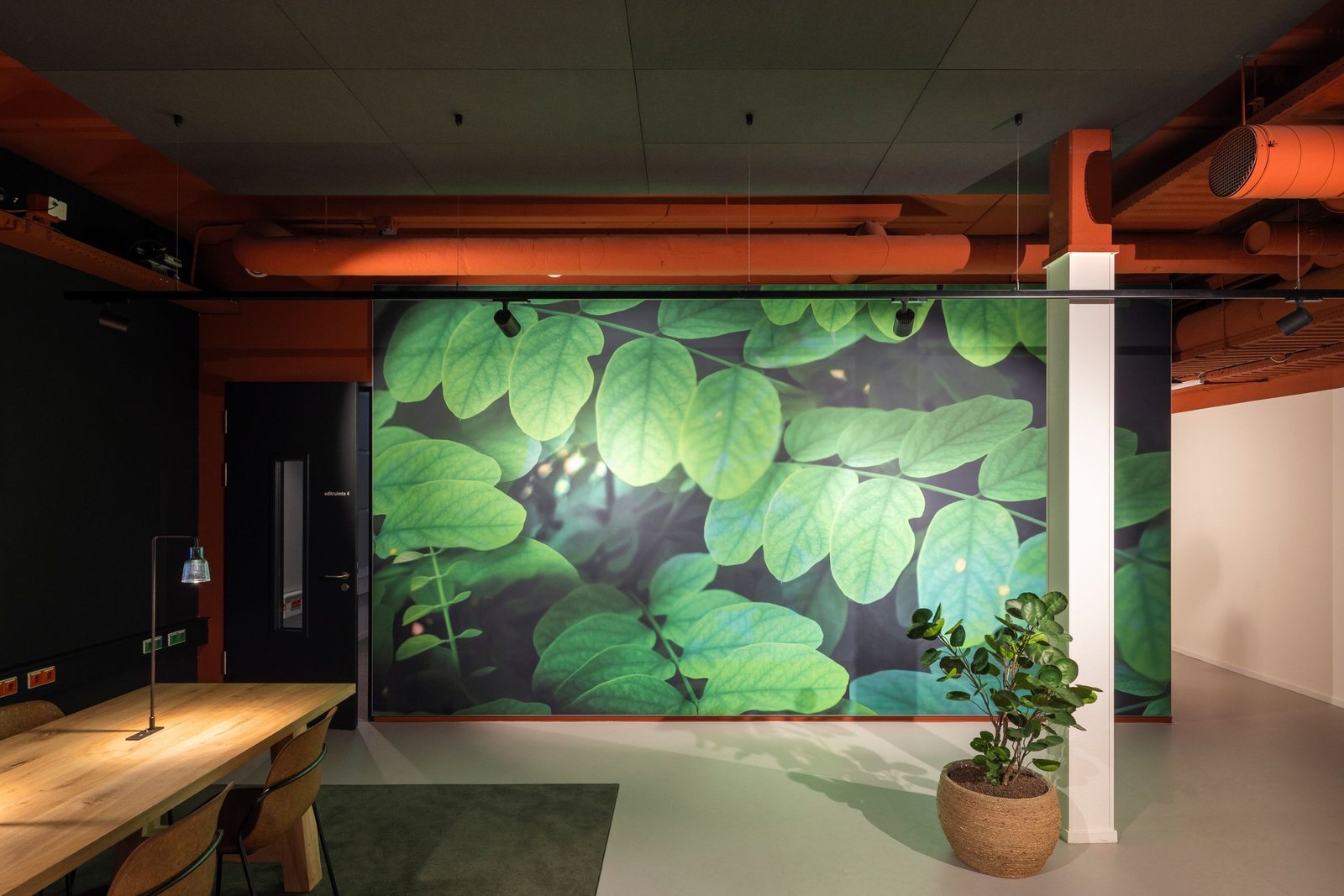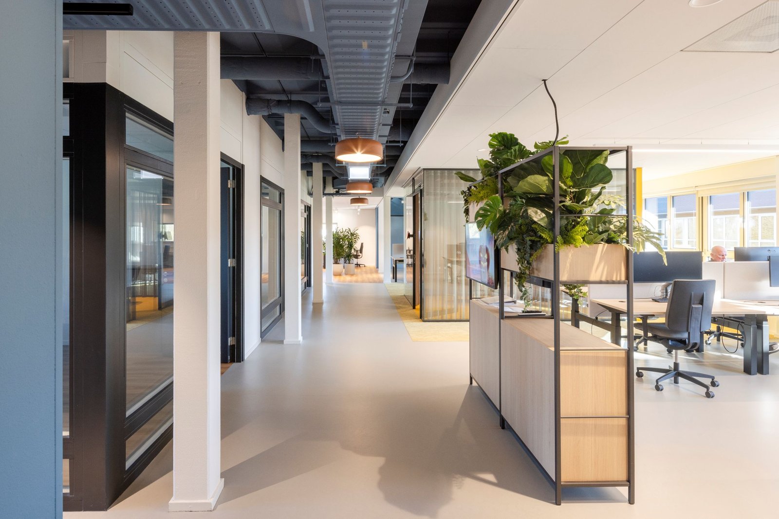 Zowel op gebouwniveau als in het interieur was het volgens de architect vanzelfsprekend dat er grote aandacht is besteed aan circulariteit en duurzaamheid. “Wat behouden kon blijven is behouden. Waar mogelijk zijn bestaande wanden blijven staan. Glazen puien en (geluidwerende) deuren zijn op nieuwe posities hergebruikt en er is niet gestuct. Frisse lucht, een prettige temperatuur, veel (dag)licht, veel groen en een goede akoestiek dragen bij aan een gezonde werkomgeving. Door nieuwe ramen in de gevel te maken en wanden weg te halen, is er nu veel meer daglicht in het gebouw. De akoestiek is verbeterd, onder andere door toevoeging van doeken met grafische ontwerpen die onderdeel zijn van het interieurontwerp. Het groen is zoveel mogelijk met echte planten ingevuld en wordt door een externe partij onderhouden.