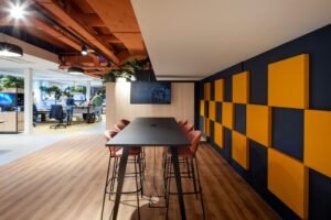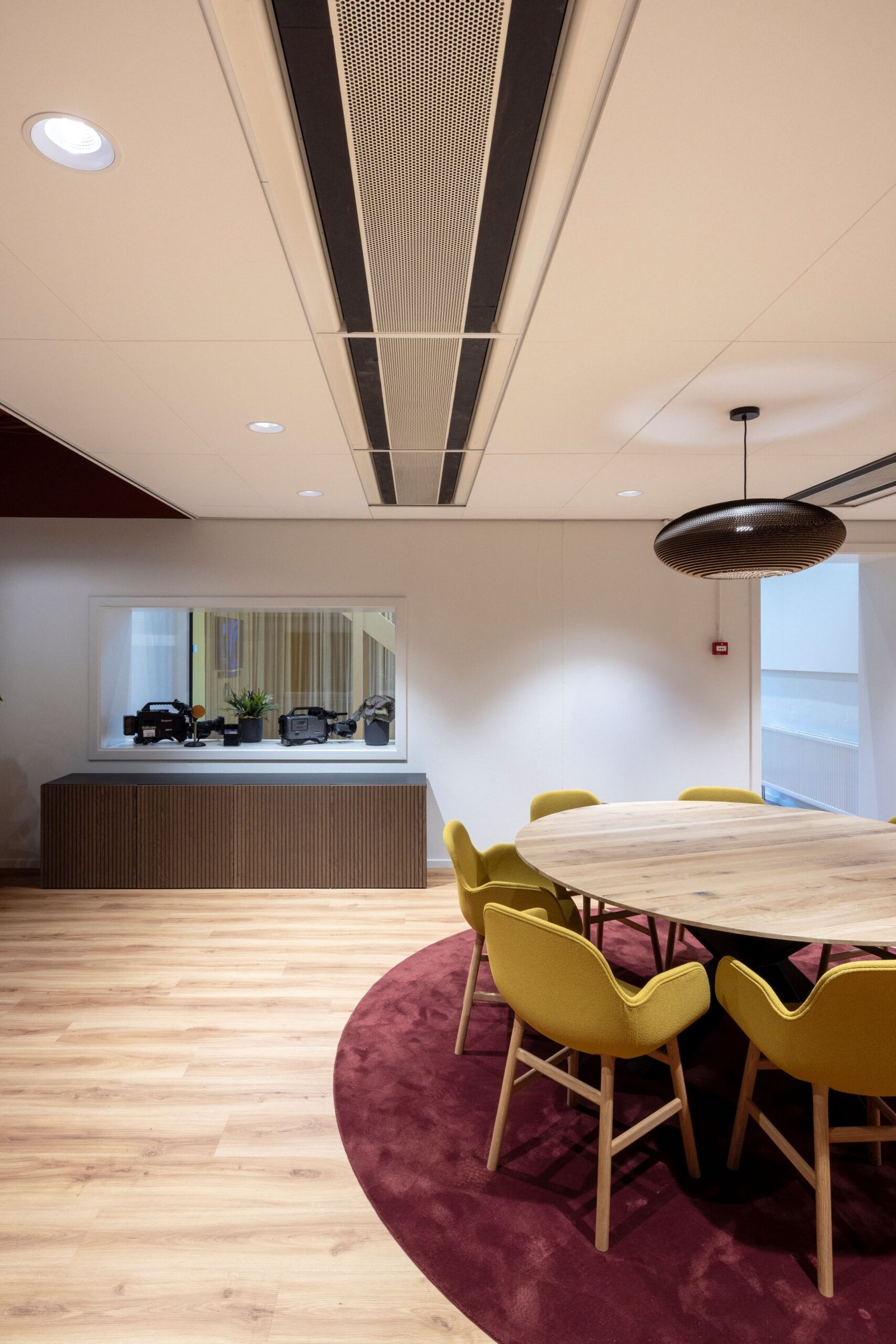 Op de tweede verdieping zit een aantal redacteuren achter hun pc te werken. Boven hen hangt tussen de oranje installatiebuizen een zwart vlak. “Hier hebben we Rockfon Charcoal B panelen aangebracht in de afmetingen 1200 x 600 x 40mm. De panelen hebben we tegen het bouwkundig plafond verlijmd, waardoor het als een naadloos plafond oogt. Door de kleine facetkanten en de kleur zwart oogt het als een geheel.” Gevraagd naar hun ervaringen met de aangebrachte akoestische oplossingen, antwoordden de redacteuren die aan de lunch zitten positief. “Het is een wereld van verschil. Niet alleen in de redactieruimte, maar vooral in de opname- en montagestudio’s. Daar wil je ook geen bijgeluiden hebben”, wordt als reactie gegeven.