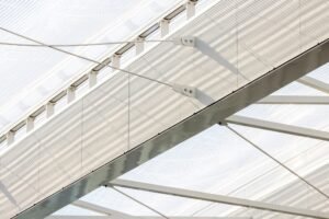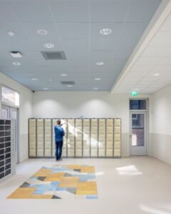 “Standaardwerk”, noemt Petersen het monteren van de plafonds in de klaslokalen. “In het monumentale gebouw hebben we eerst in de klaslokalen de oude plafondpanelen gedemonteerd. Vervolgens hebben we daar – net als in de klaslokalen in de nieuwbouw – Rockfon Pallas-panelen in de kleur standaardwit gemonteerd, maar ook circa vijfhonderd vierkante meter Color-all-in de kleur Fresh, een mooie blauwe tint. De gymzalen – een grote en een kleine – de dojo en de bergingen zijn als laatste tegen de oudbouw aangebouwd. Vanwege de stootbelasting hebben we hier Rockfon Boxer-panelen gemonteerd. De school heeft een muzieklokaal en twee muziekstudio’s. Het muzieklokaal is voorzien van een Ecophon systeem, een verlaagd plafond met zichtbaar ophangsysteem met demontabele panelen die een hoge geluidsabsorptie hebben. In de muziekstudio’s zijn de MS-wanden akoestisch ontkoppeld van het bouwkundige plafond. Daaronder is hetzelfde systeem van Ecophon gemonteerd.”