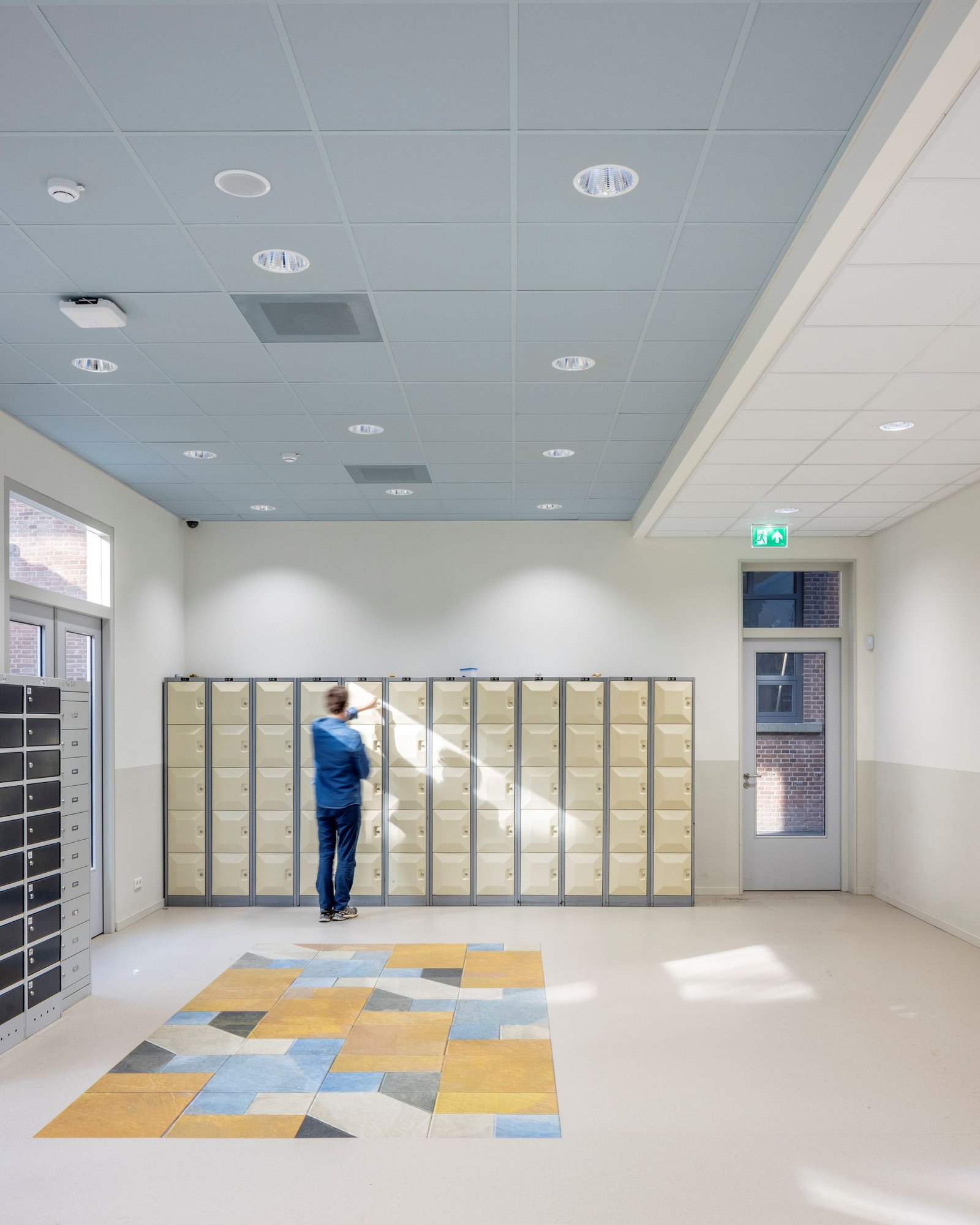 De gym- en feestzaal in de vleugel uit de jaren vijftig van de vorige eeuw is doorgesneden. “Hiermee hebben we ruimte gecreëerd voor de nieuwe hoofdentree aan het schoolplein. Als kunstlokaal en buitenpodium heeft dit bouwdeel opnieuw een culturele functie gekregen. Door de glazen pui is deze ruimte net als vroeger dé plek voor voorstellingen en exposities. Een zitkuil in het plein markeert de contouren van het verwijderde bouwdeel en draagt bij aan de multifunctionele inzetbaarheid voor pauzes, ontmoetingen en bijeenkomsten”, legt Kerssies uit.