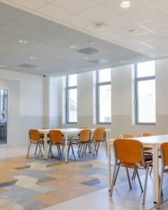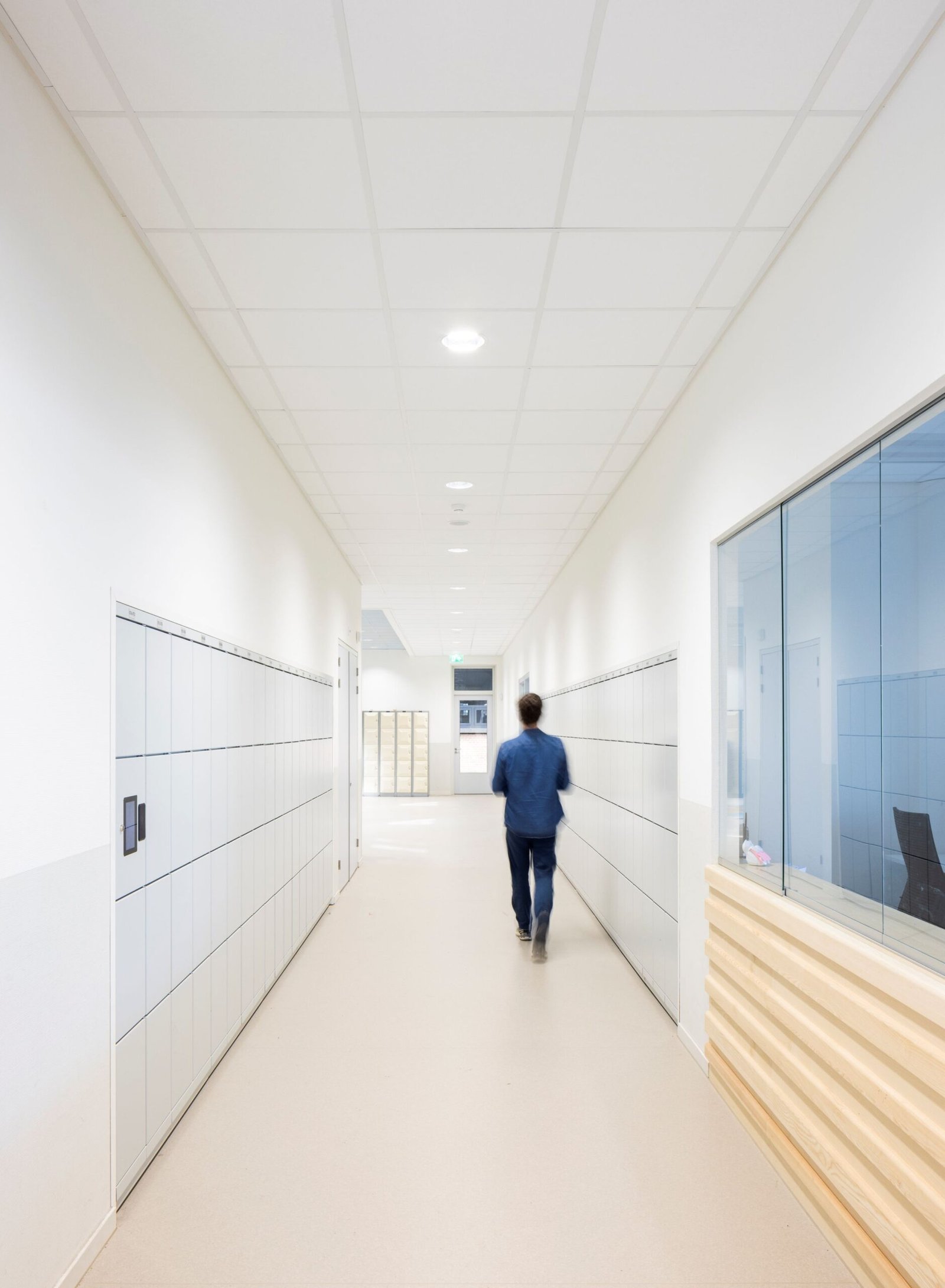 In de gangen van de nieuwbouw is een vrijhangend plafondsysteem toegepast, vertelt Petersen. “Hier hebben we Rockfon Krios-panelen in de afmeting 600 x 2100 gemonteerd, zonder raster. De architect wilde per se geen kader om het plafond. Daarom hebben we Z-profielen gebruikt. De laatste plaat hebben we zonder profiel gemonteerd, het profiel is erop gelijmd. We hebben een heel lang proefstuk gemaakt om te checken of de lijm het hield.”