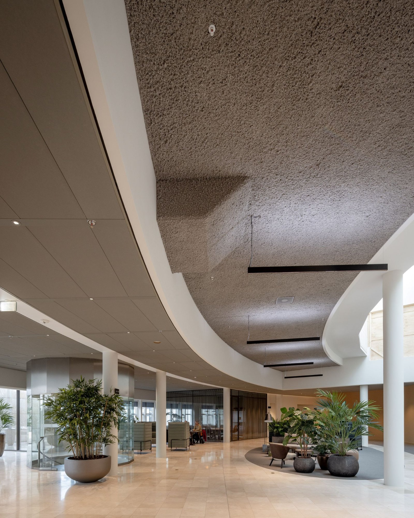 De begane grond van het entreegebouw is opgeleverd. Voor ACN Totale Afbouw zit het werk er nog niet op, vertelt bedrijfsleider Jacobsen. “Fase 2 van het project bestaat uit de eerste verdieping, nu nog verborgen achter de houten panelen”, vertelt hij, terwijl hij naar boven wijst. “Dat is in feite een kopie van de begane grond, dus ook met de ronde vormen. Dit betekent weer alles opnieuw op- en inmeten. Hier wordt het restaurant gevestigd met bijbehorende keukens. Daar gaan we overigens een nieuw product van Rockfon monteren, Rockfon CleanSpace Pro. Dit is een plafondpaneel dat hoge geluidsabsorptie biedt en tegelijkertijd bestand is tegen verschillende reinigings- en desinfectiemethoden. Toepasbaar in ruimtes waar hygiëne een belangrijke rol speelt en ISO klasse 4 gecertificeerd.”