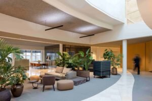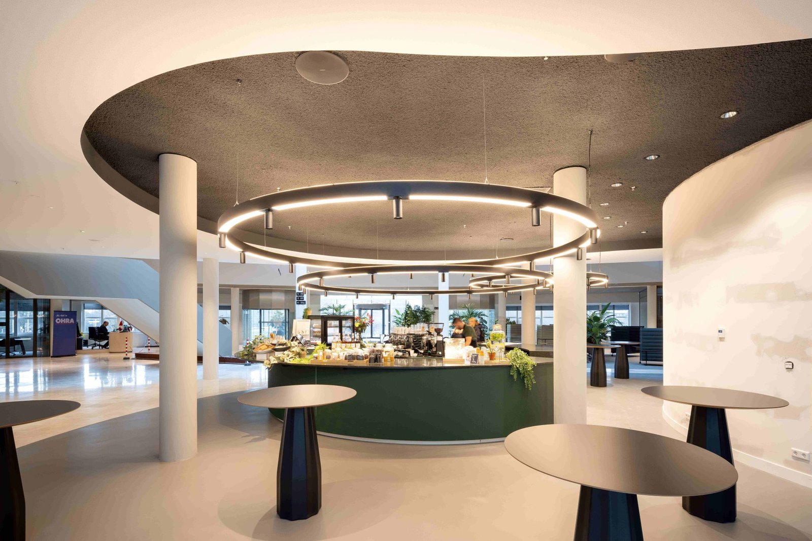 Een bijna leegstand kantoorpand heeft een transformatie ondergaan en is klaar voor de toekomst. Met een nieuw verhuurconcept, waarbij het ontzorgen van ondernemers centraal staat, meer transparantie – zowel in daglichttoetreding als in een logischere routing – natuurlijk kleurgebruik en veel aandacht voor duurzaamheid is het pand klaar voor een nieuwe toekomst. Het centraal gelegen entreegebouw, dat in een ronde vorm loopt, heeft onder andere een nieuw plafond gekregen. Dit loopt met de vorm van het gebouw mee, een kunststukje van ACN Totale Afbouw.