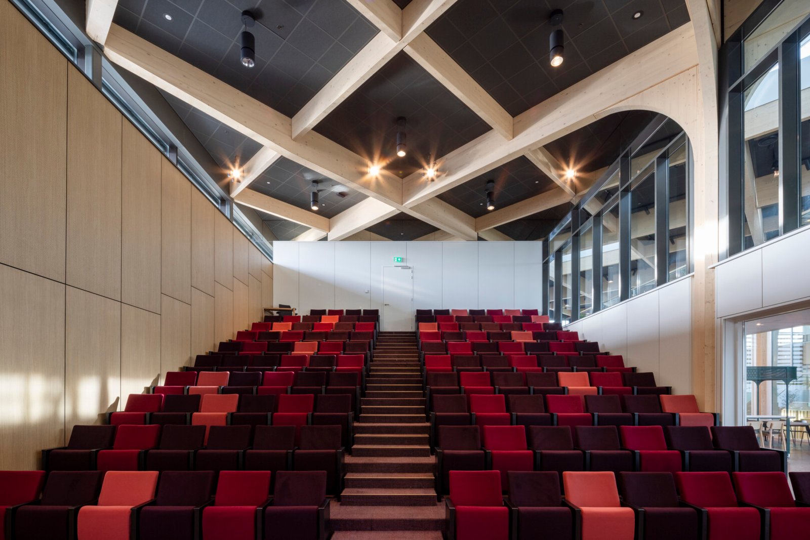 Het kleurencontrast komt sterker terug in het auditorium, vervolgt de projectleider zijn verhaal. “De tribunes met zittingen die in verschillende kleuren rood zijn uitgevoerd, van licht tot echt donkerrood, met de prachtige, hoge akoestische wand in een lichte houtkleur en het donkergrijze plafond. De wand is zeven meter hoog, hierin is onze expertise echt tot uiting gekomen. Dat is echt maatwerk”, legt hij uit.