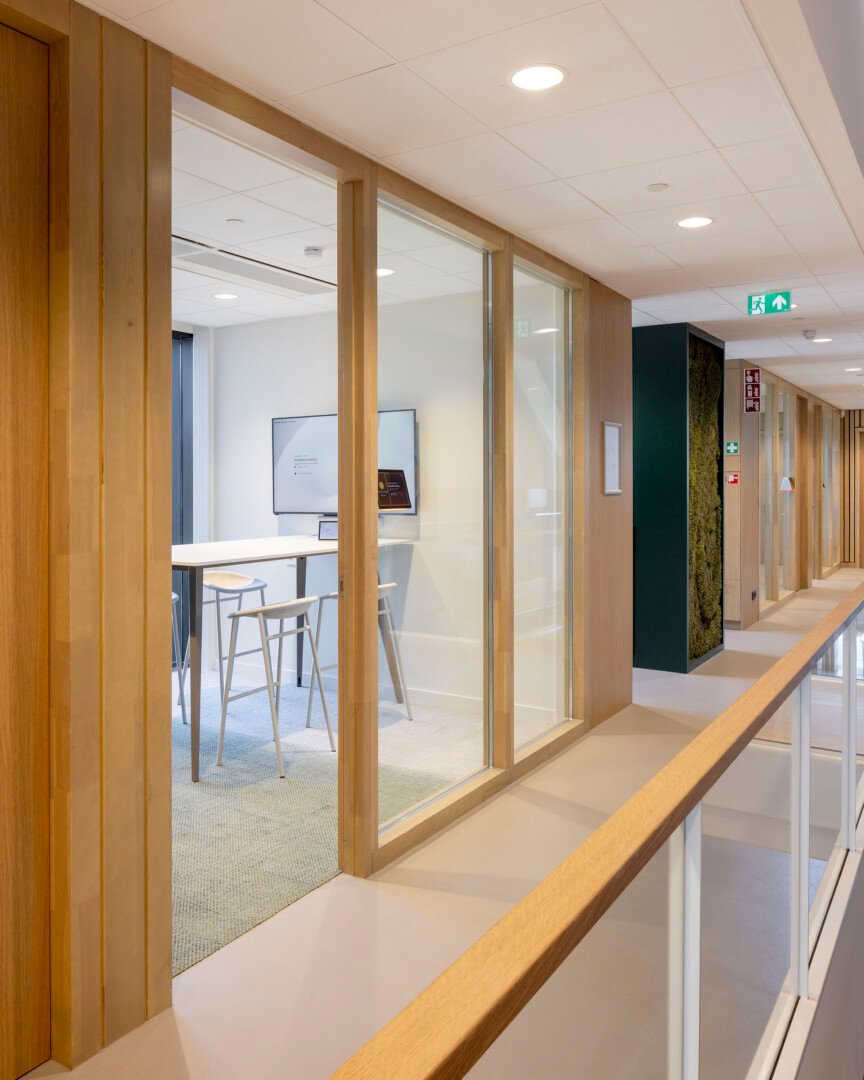“Ik zeg dat niet vaak, maar het ontwerp van de architect is echt prachtig.” Sjaak doelt op de multifunctionele ontmoetingsruimte (MFO) in het centrale atrium. “De spanten zijn in een ruitvorm uitgevoerd en zichtbaar gebleven. In de vlakken van de ruit hebben wij de al genoemde Color-all Special panelen gemonteerd. Een echt blikvanger, ook door het contrast qua kleuren. De lichte houtkleur van de spanten, deze kleur komt ook terug in de trappen en akoestische wandbeplating – die wij overigens custom made hebben gemaakt – in combinatie met het donkergrijs van de plafondpanelen en het groen van de planten in de bakken en de mospanelen, die wij overigens niet hebben gemaakt. Het is echt een plaatje om te zien”, vertelt hij enthousiast.