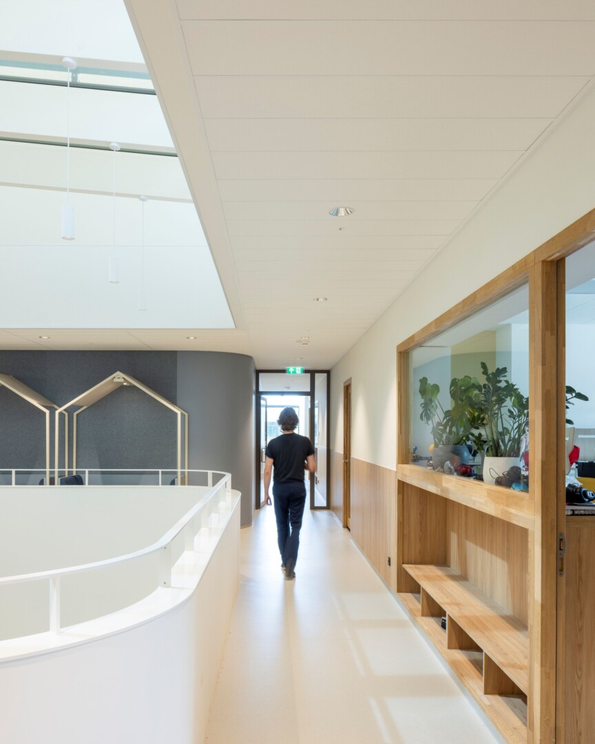 Ook in het interieur is veel aandacht besteed aan het creëren van intimiteit en rust, stelt de architect van DP6 architectuurstudio. “Natuurlijke materialen, afgeronde hoeken, veel daglicht en een uitstekende akoestiek vormen hiervoor de basis. Net als aan de buitenzijde van het gebouw zijn de zichtlijnen door de verspringingen en knikken nooit te lang, wat het grote gebouw kleiner doet aanvoelen dan het daadwerkelijk is.”